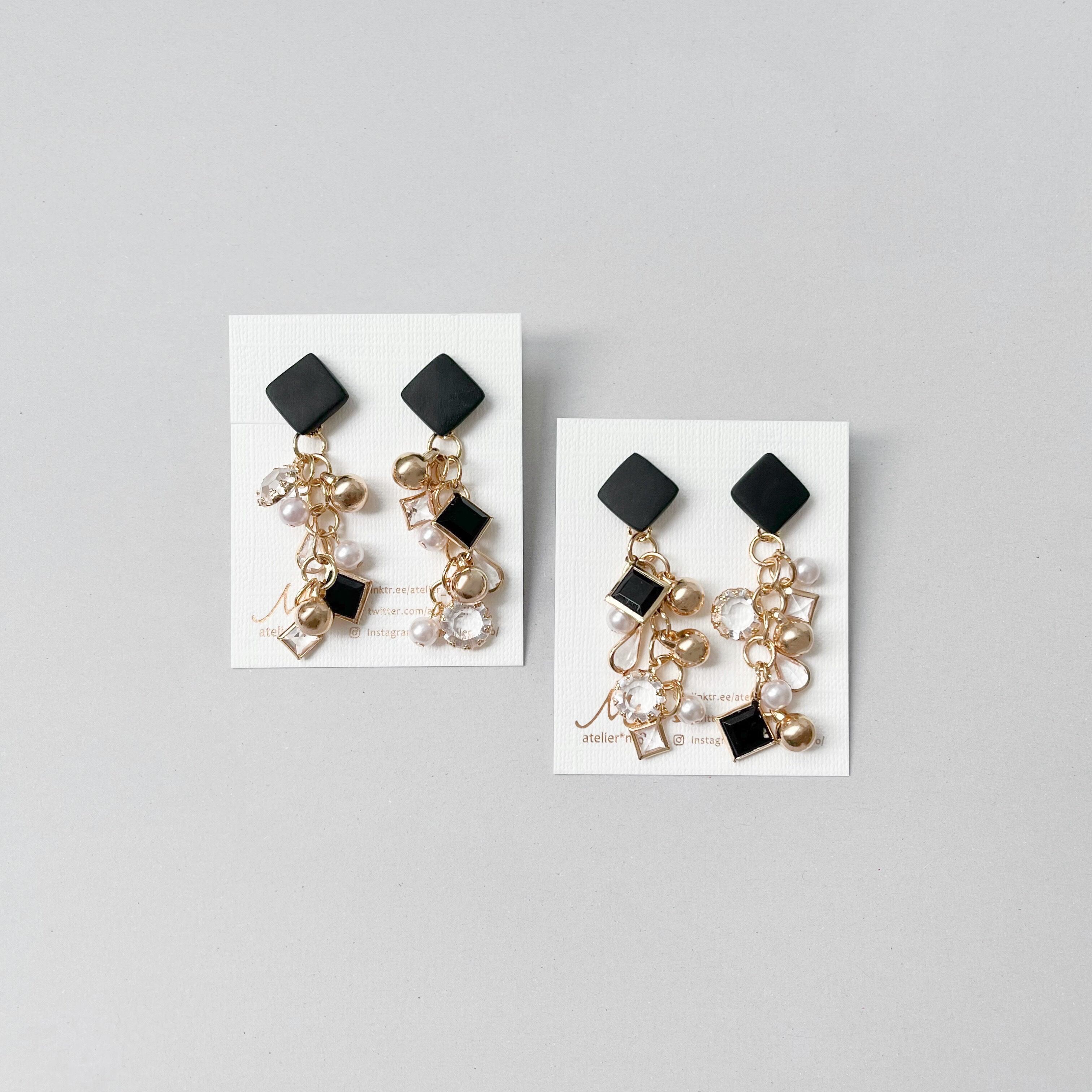 焼き物ならではのマットな質感が魅力のクレイストーンに様々なオーナメントが連なるジュエルチェーンを合わせた異素材mixデザインの揺れるピアスです。